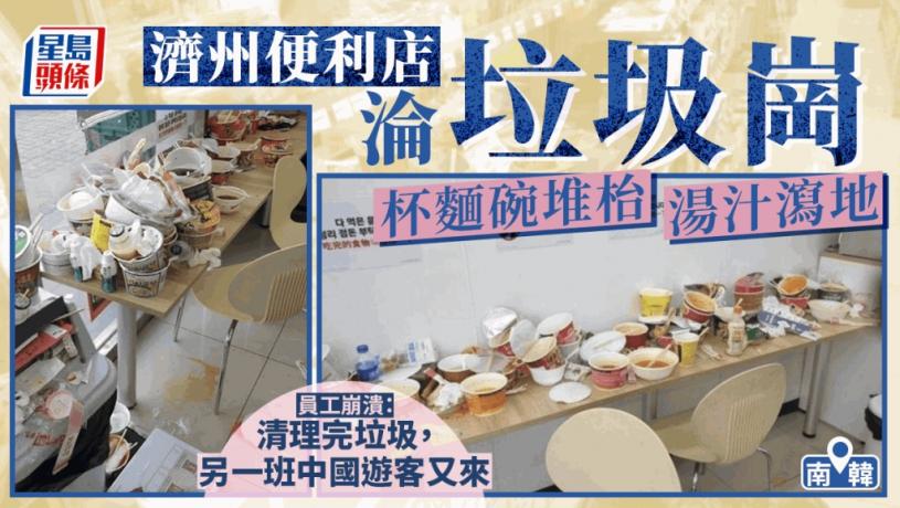 隨着全球觀光復甦,南韓旅遊勝地濟州成為中國遊客熱點,但爭議事件亦隨之湧現。繼日前有疑似內地遊客讓小孩子當街大便,惹來南韓網民抨擊後,再有便利店員工上載照片,批評中國遊客遺下大量杯麵、飲品和即棄餐具等垃圾,便利店儼如「垃圾崗」。
