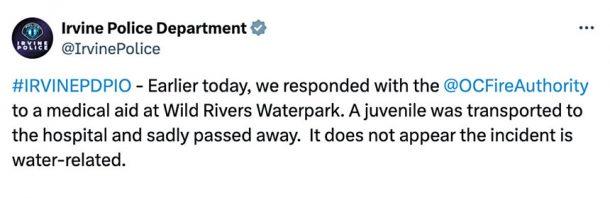 據爾灣市警察局稱,週六上午11點剛過不久,橙縣消防局接獲緊急醫療求助,並立即向Wild Rivers Waterpark派出急救人員,隨後一名未成年人被送往附近的醫院,但不幸在醫院被宣告死亡。