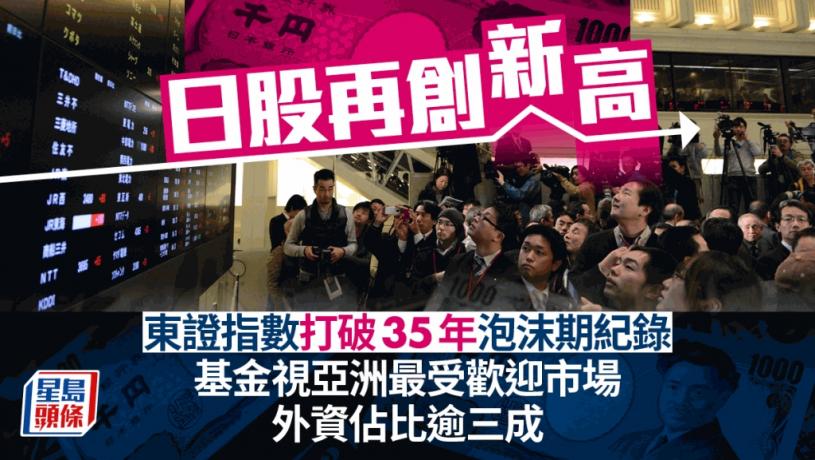 日本股市再創新高,日經225指數今日(4日)曾升近1%,逼近今年3月以來高位;東證指數亦曾升1%至2900.91點,突破日本泡沫經濟期1989年12月的盤中歷史高位2886.5點。日經225指數收報40913.65點,升0.82%,東證指數收報2898.47點,升0.92%。今年至今計,兩個指數均累升逾22%。