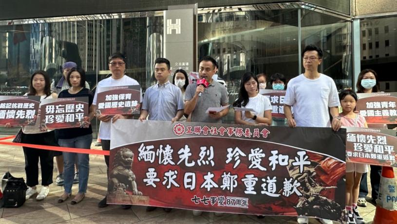 工聯會社會事務委員會今日(7日)就「七七盧溝橋事變」87周年,到日本駐港總領事館請願,要求日本正視侵華歷史和鄭重道歉,並呼籲市民銘記歷史,緬懷先烈。工聯會促請政府加強推廣愛國教育,讓年青一代真正認識史實,增強民族自豪感。