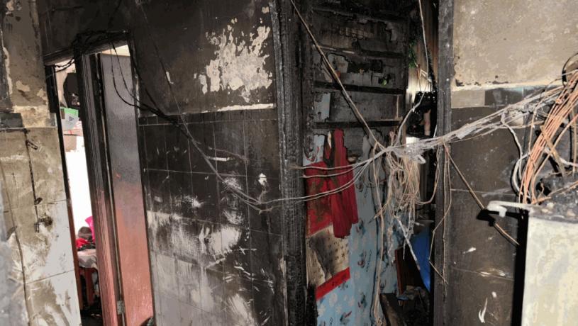 據了解,涉事大廈樓高6層連天台,為一梯四伙,起火單位位於5樓,現埸所見,單位內至少有3間房,全部已付之一炬,四壁亦嚴重熏黑,大量傢具雜物被燒得熔熔爛爛,滿目瘡痍,但門外放有一輛滑板車及疑似電動單車則未有被波及。