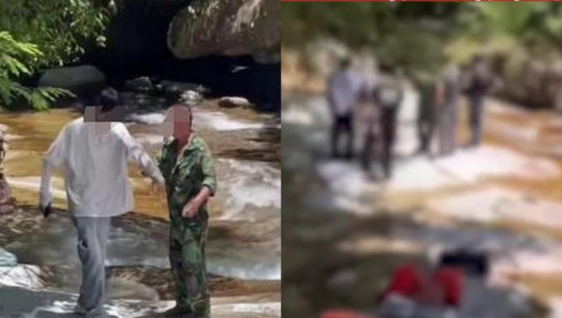 影片顯示,在位於一處河邊的石頭上,一名男子正對著另一名白衣男子推搡,隨後一群人圍了上來,一名黑衫男子喊道:「你跟我!跟著我走,我叫你走,這是我私人地方。」旁邊一名女遊客不停說道:「不要動手!」