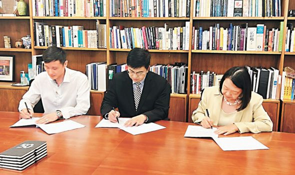 (左起)龍傑、李銘輝、余慕潔在合作備忘錄上簽字。