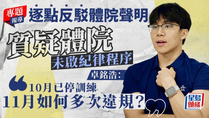 第三,體院指卓銘浩在去年10月至11月期間再次違反紀律等。卓銘浩表示去年於9月30日完成亞運回港,至10月18日下午就已被停止訓練,直至其後被通知12月1日起退出港隊。