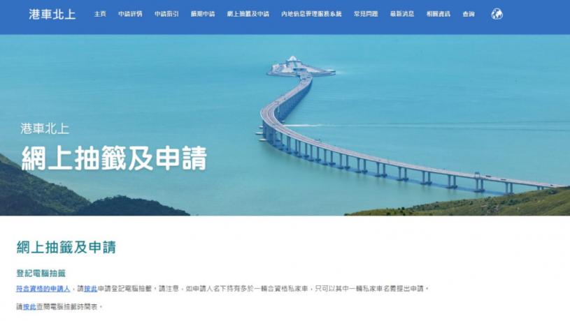 符合資格的「港車北上」申請人,可透過指定網站 www.hzmbqfs.gov.hk 登記電腦抽籤。中籤者須按電腦系統隨機分配的日期於指定時間內,遞交「港車北上」的申請。