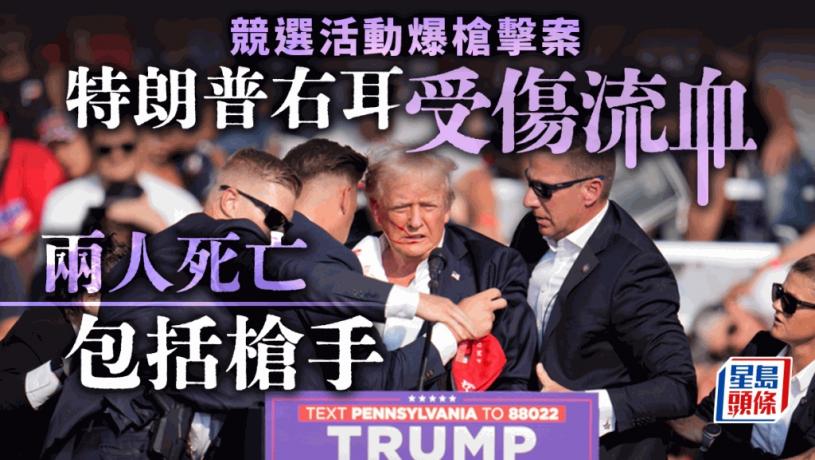特朗普周日在賓夕法尼亞州的競選集會上突然響起了多聲槍響,特朗普很快被特勤人員包圍,並在地上待了大約一分鐘。他其後站起來,並揮舞拳頭,由舞台上被護送到一輛車內,隨後將他帶離現場。