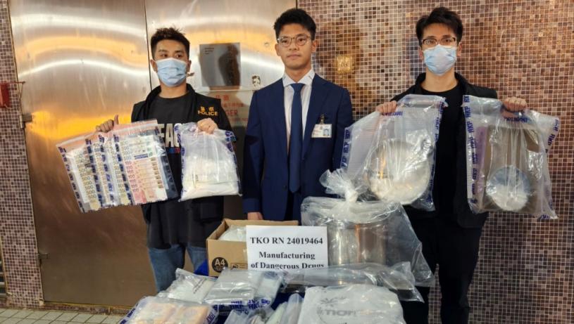 警方根據情報及深入調查,鎖定將軍澳尚德邨一個公屋單位,懷疑有人利用單位製毒。至今日(7月17日)中午,警方見時機成熟,於單位外截查並拘捕一名男子,並在其公屋單位內搜獲約110克懷疑霹靂可卡因、約992克可卡因,以及一批製毒工具如電子磅、電磁爐、煮食工具等。涉案毒品共約值220萬元。