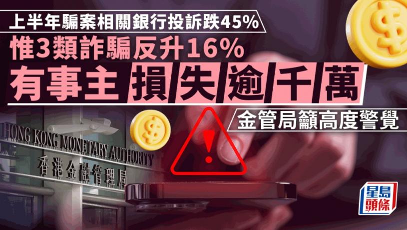 今年上半年共收到350宗與騙案相關的銀行投訴個案,較去年同期下跌45%。金管局副總裁阮國恒指出,其中未經授權信用卡交易的投訴個案按年跌65%,但投資案、網上情緣及一些新型騙案手法誘使受害人進行授權支付的個案則上升16%。