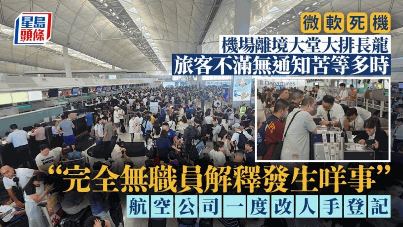 微軟Windows系統全球故障,今(19日)午港機場運作受到影響,《星島頭條》記者在機場離境大堂了解,部分航空公司櫃位改用人手辦理登記手續,旅客大排長龍,不少等了超過三小時,有旅客批評機場資訊不足,許多人不知道發生甚麼事。