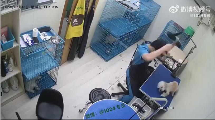 該寵物主人發出了寵物醫院的監控視頻,顯示一名青年男子為一小狗護理時,小狗似乎咬了該男子一下,男子立即大怒,用電吹風機大力暴打小狗,小狗之後掉在地上。