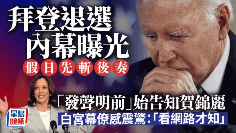 美國總統拜登周日閃電宣布退選,並力挺副手賀錦麗接棒。知情人士透露,拜登是在上周六(20日)晚上決定退選,並由2名資深顧問起草聲明,而賀錦麗周日(21日)在消息公開前最後一刻,才得知拜登的重大決定。另外,有不少幕僚團隊表示,他們是在網上看到聲明,才知道拜登要退選。據報拜登按照慣例在任何重大決定之前先召開家庭會議,隨後找來心腹擬定退選聲明。直到公布退選聲明後,拜登才致電國會領袖及其他盟友,親自告知消息。