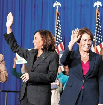 副總統賀錦麗(左)2022年11月到波士頓為希利競選州長站台。 檔案圖片