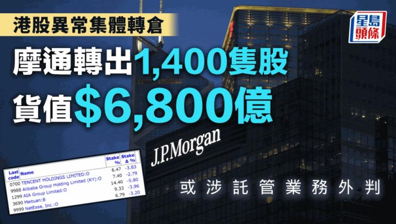 國際投行摩根大通(JP Morgan)今年決定外判其香港及台灣的本地託管業務,令近日港股市場的倉位有大量異動。據中央結算系統(CCASS)及金融資訊網站Webb-site的資料顯示,摩通於周一(22日)合共轉出近1,400隻股份,總貨值涉及高達6,800億元,佔其CCASS持倉逾33%,而同日滙豐倉位大增,意味接收了大部分股份。
