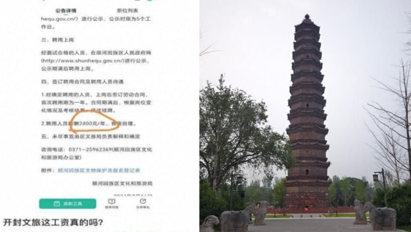 河南開封網友近日發帖表示,順河回族區文化和旅遊局招聘文物保護員,在招聘資料其中一項寫到:聘用人員薪酬2400元/年,食宿自理。有網民質疑招聘廣告的真偽,但亦有人認指可能是打錯。