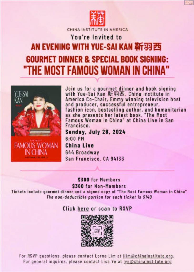 當地時間 7 月 28 日晚間,著名華裔化妝品企業家、艾美獎獲獎電視主持人、暢銷書作家和慈善家靳羽西將在美國舊金山舉辦英文自傳簽書活動。值得一提的是,活動在舊金山聞名的餐廳「China Live (明店)」舉辦。來賓在與羽西面對面探討關於時尚以及商業先鋒的話題的同時,還將與羽西共享一場頂級中餐的文化盛宴。