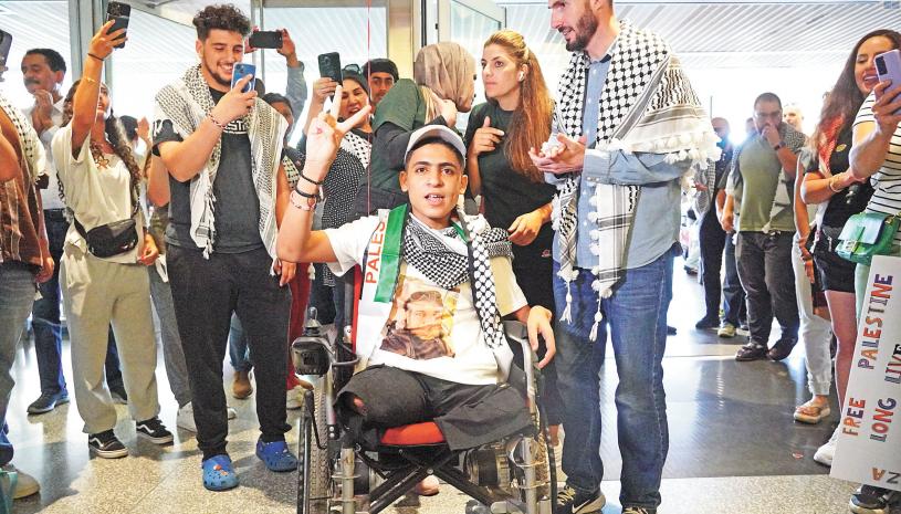 現場500多名支持者及媒體在機場守候,終盼到哈邁德自己推著輪椅「走」出安檢大門,大家歡聲雷動,揮舞著橫幅、招牌,送上鮮花與擁抱。
