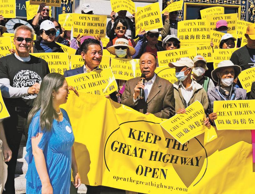 繼上周四在大公路舉行百人集會和遊行後,昨日上午在三藩市市政廳門前,更多民眾聚集,高舉「開放海傍公路」標語表達訴求,有華裔長者更因情緒激動和天氣炎熱,不支倒地。
