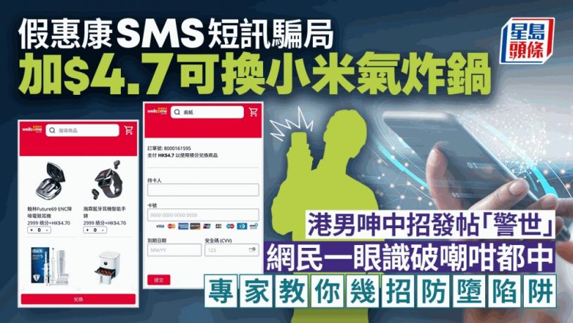 該港男在連登討論區以「而家d呃人sms越來越真實」為題發帖,指收到SMS短訊,稱惠康指他的賬戶積分將於當天到期,並附上網址連結提醒港男盡快兌換禮品。該名港男不虞有詐點擊相關連結,稱假惠康積分換領網站製作極爲逼真,頁頂顯示惠康的名字及商標,網站內換領的禮品也極其吸引,包括僅加4.7元即可兌換多種貴價商品,包括運動手錶、電動牙刷、小米氣炸鍋等,認爲「加$4.7就換到咁多嘢」、「價格優惠呀」,因此按照指示填寫信用卡信息並進行支付,事後才發現可能中招。
