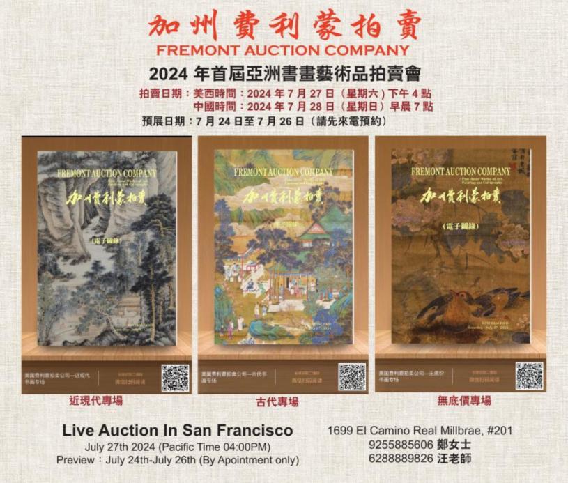 最近,加州費利蒙拍賣將舉行2024 年首屆亞洲書畫藝術品的拍賣會,拍賣時間為美西時間2024 年7 月27 日星期六下午4 時,北京時間2024 年7 月28 日星期日早上7 點。預展時間為7 月24 日至7 月26 日,請提前預約。拍賣會地址為1699 El Camino Real #201, Millbrae, CA 94030。聯絡電話為汪老師628-888-9826,亦可洽詢鄭女士925-588-5606。