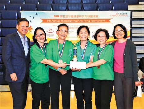 克里斯滕森市長 (左一)給乒乓球賽獲獎選手頒獎。 檔案圖片