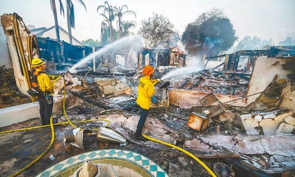 消防人員持續在火災現場巡視,已確認有無燃燒熱點。NBCLA新聞畫面