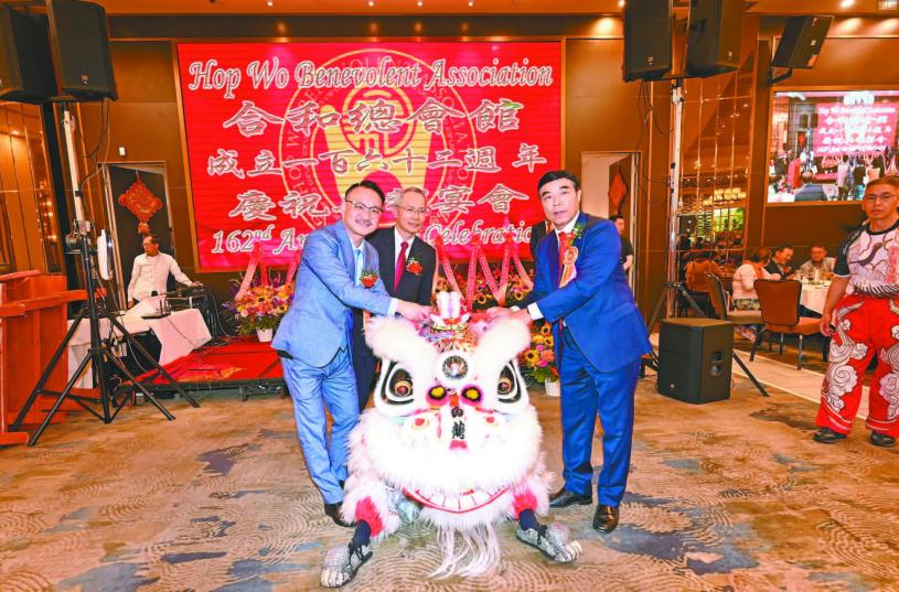 梁館白鶴醒獅健兒親臨助慶,歡騰躍舞,呈送吉祥。僑務副委員長阮昭雄、經文處處長賴銘琪、合和主席謝躍池共同為新獅點睛,簪花掛紅,祈願總會館會務興隆,萬事順景。