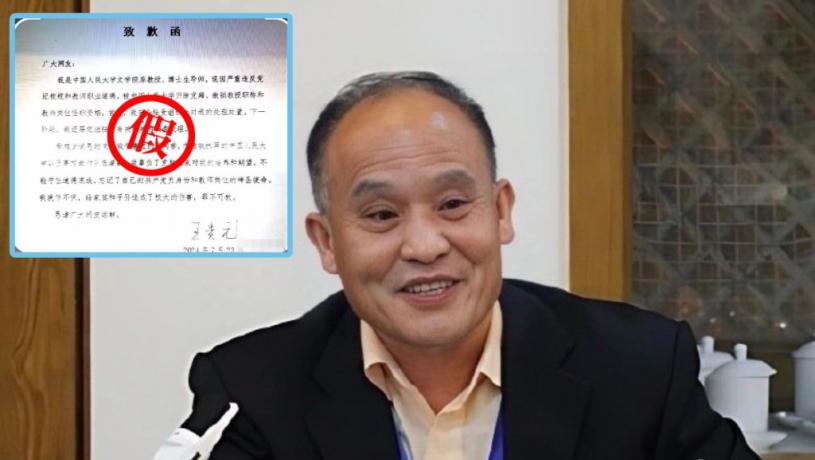 該封《致歉函》內容指出,就事件向受害人道歉,更接受上級的處理。信中內容更指,自己是「晚節不保」,對家庭及子孫造成極大傷害,罪不可赦。隨後內地傳媒從中國人民大學相關部門處獲悉,該網傳《致歉函》是假的。