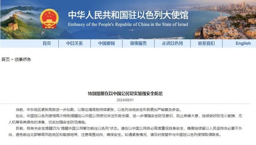 哈馬斯領導人哈尼亞在伊朗遇刺身亡,加劇加沙以巴衝突可能蔓延和擴大的擔憂。中國駐以色列使館呼籲在以中國公民繼續做好防範火箭彈等各類襲擊的準備,加強安全防範措施。