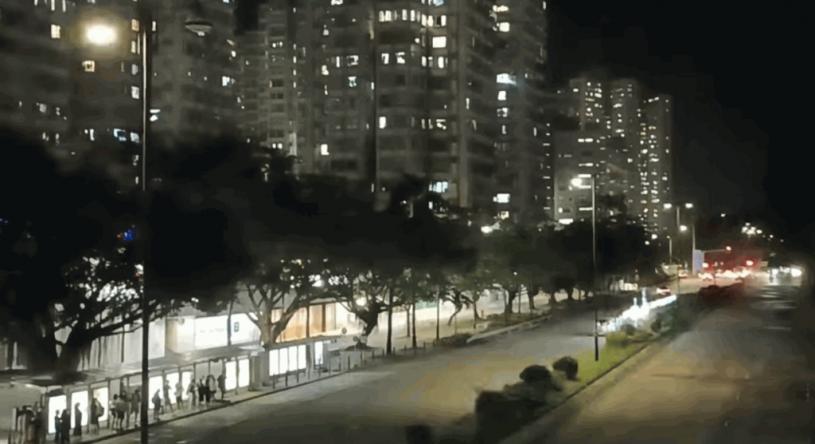 其中一段影片估計是大埔中心路段,附近居民從高處用手機拍下,在路燈閃個不停下,整片道路恍如在開Disco派對。