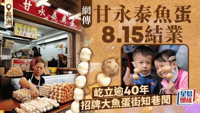 魚蛋為香港特色小食之一,其中位於長洲的「甘永泰魚蛋」更是當地人氣名店之一,常有遊客排隊買招牌大魚蛋。然而,區內名物或將成為歷史,有網民在社交專頁引述店員指,該店只會營業至8月15日,然後就「光榮結業」。