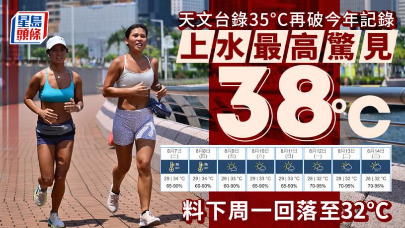 下午2時半,位於京士柏的天文台總部錄得35°C高溫,打破今年7月7日34.8°C的最高溫記錄,再於下午4時再度打破今午2時半的記錄,達35.4°C,上水更在下午3時許一度錄得38.9°C。