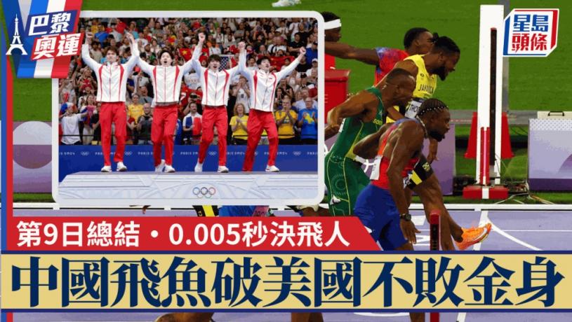巴黎奧運第9日,新任百米飛人誕生,美國跑手尼爾斯(Noah LYLES)跑出9秒784,但衝線後仍要等待近1分鐘讓大會以影相判決勝負,非常刺激。國家泳隊在男子4X100米混合接力賽終結美國隊在此項目64年的不敗之身,給予對方史上首敗,吐氣揚眉。樊振東在乒乓球男單成功為王楚欽報仇,勇奪金牌,個人成就大滿貫。吊環王劉洋為國家隊在今屆體操賽事開齋,取得首面金牌﹗