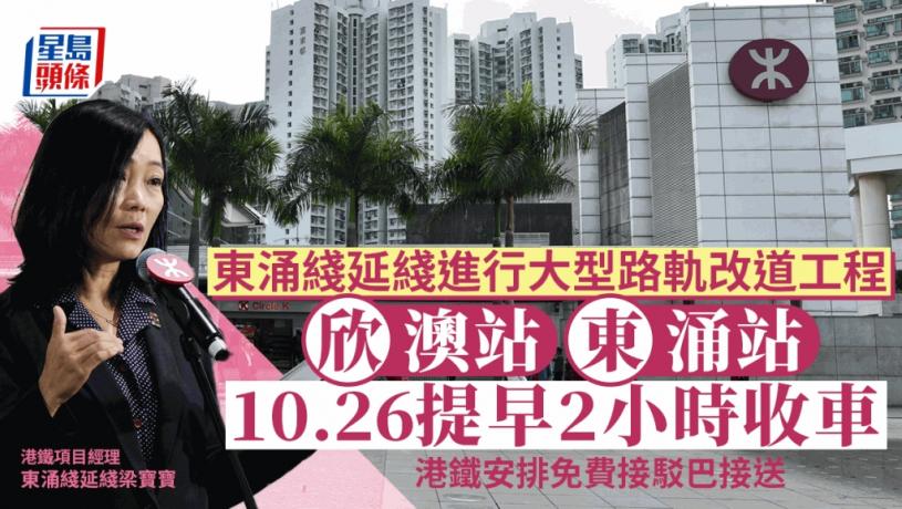 港鐵公司今日(5日)宣布,為配合東涌綫延綫大型路軌改道工程,東涌綫將於今年10月26日(星期六)小範圍調整服務,當晚往來東涌線至欣澳站的列車,將提前約2小時收車。港鐵預計翌日(27日)恢復正常服務,頭班車如期開出,港鐵今日將會交代相關安排。