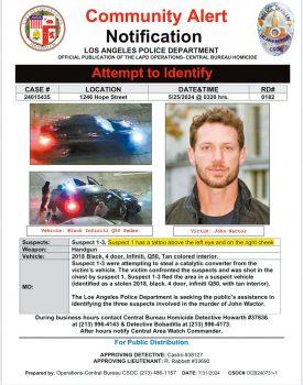 洛杉磯市警局調查人員週日也發布了事發當下的部分監視器靜態畫面,呼籲知情民眾提供資訊。民眾若有任何消息可以在工作時間致電(213)996-4143聯繫兇案調查人員Howarth,或撥打(213)996-4173與調查人員Bobadilla聯絡。