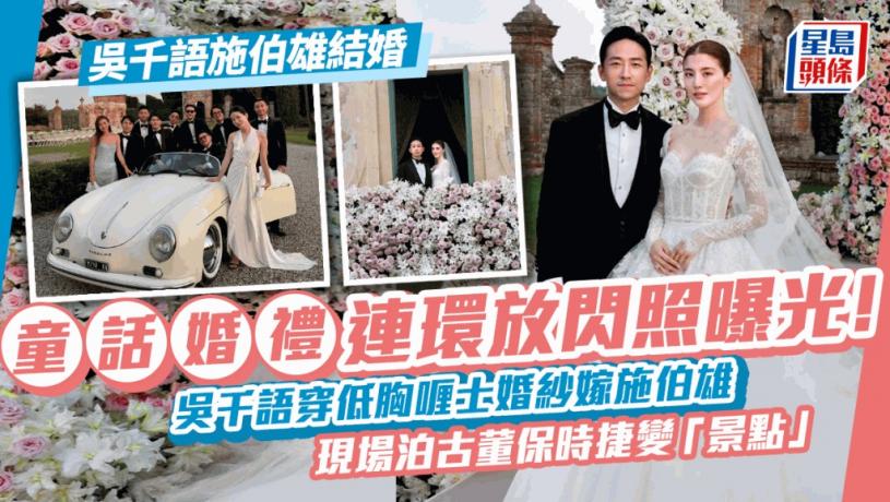 施伯雄揸古董車帥氣進場,吳千語則手執花球優雅進場,兩人在現場近百位賓客見證下宣讀誓詞,從初相識的第一印象到如何相知相愛,再對對方愛的承諾。最後雙方講一聲I Do,婚禮正式完成。在彩虹煙火映襯下,兩人拗腰深情擁吻,,身後的家人一臉笑容。兩人又站在露台上接受大家的祝福,美得像古堡裏的王子公主。兩人好友都有分享現場照片,見到在場還有一輛古董保時捷跑車,賓客都爭相打卡拍照留念。