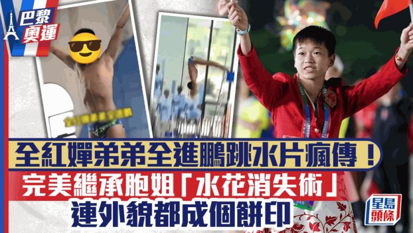 中國跳水隊全紅嬋與陳芋汐在巴黎奧運出戰女子雙人10米跳水決賽奪得金牌,兩人展現神同步的「水花消失術」熱爆網絡,全紅嬋的一舉一動更加成為網民焦點。自小在廣東邁合村成長的全紅嬋,父母都是農民並育有5個子女,全紅嬋排行第三,胞妹全紅桃及胞弟全進鵬原來都是跳水選手,泳術不下於胞姐全紅嬋!