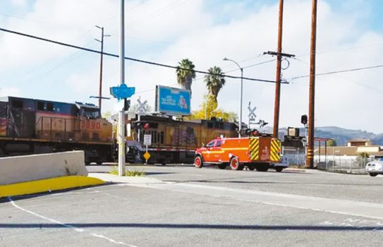洛縣消防局的車輛在該鐵道路口被火車擋住。官網截圖