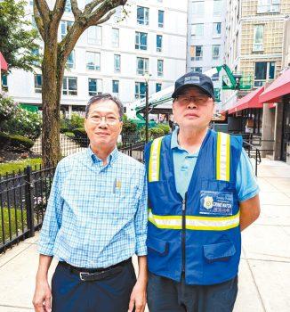 (左起)雷國輝、阮鴻燦在博愛樓前合影。李强攝