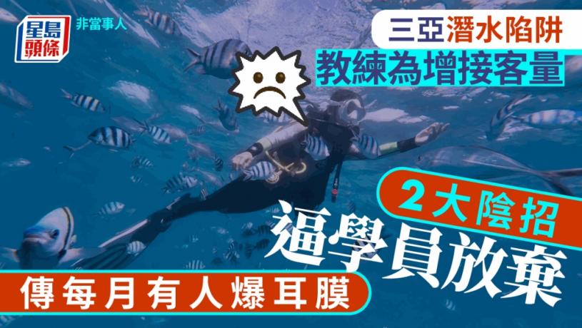 海南三亞作為內地的潛水勝地,每年接待的潛水遊客以百萬人次計,但因監管不嚴和利之所在,潛水「教練」資格成疑、亂收費外,為了應付龐大客量,甚至有教練會刻意粗暴對待學員,包括強按學員入水、摘開潛水鏡等,令學員抵受不了水壓及恐慌,提早上浮。有業內人士透露,每月也有遊客因「黑教練」的陰招而過快上浮導致耳膜穿孔。