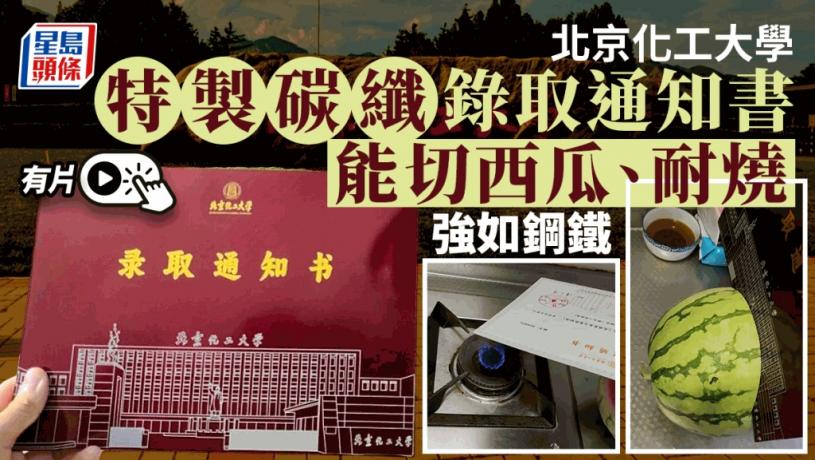 內地有高校將高科技融入到學生的錄取通知書上。北京化工大學有新生實測今年用碳纖維製成的錄取通書,確認它能水火不侵,用來切西瓜,令網民嘖嘖稱奇。