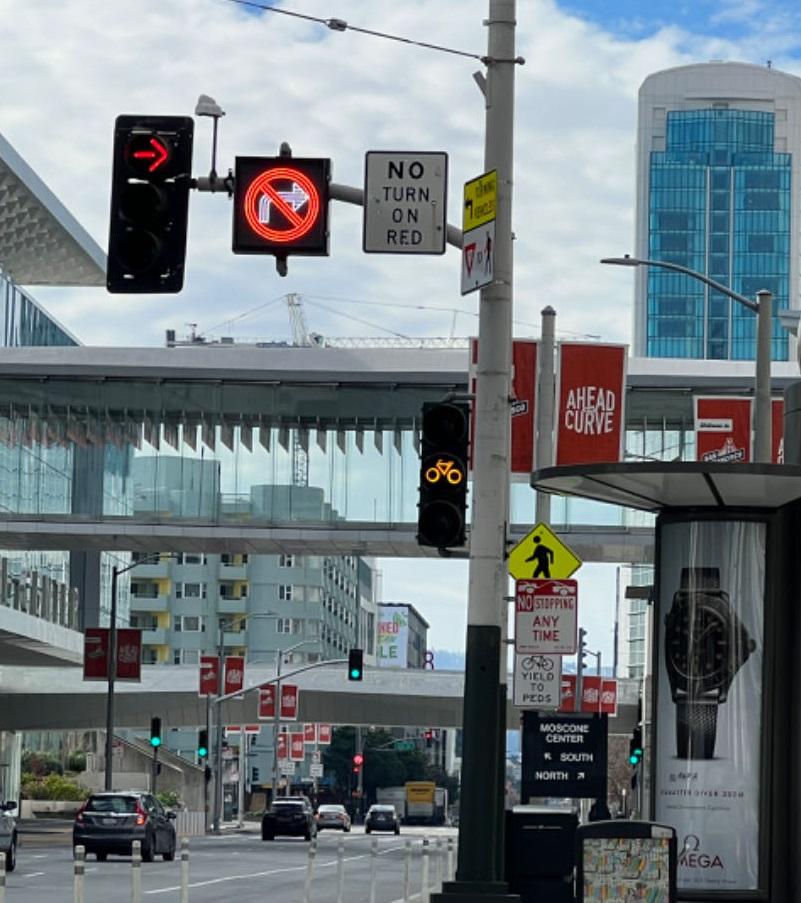 禁止紅燈右轉在加州屬於異常舉動,因為州法容許司機紅燈右轉進入行人穿越道,有別於向來禁止紅燈右轉的紐約市等地。
