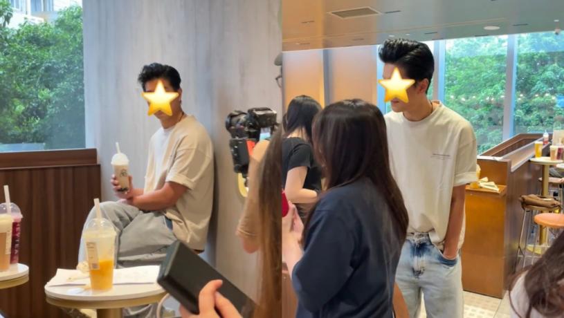 有網民在廣州一茶飲店偶遇黎諾懿在進行拍攝工作。
