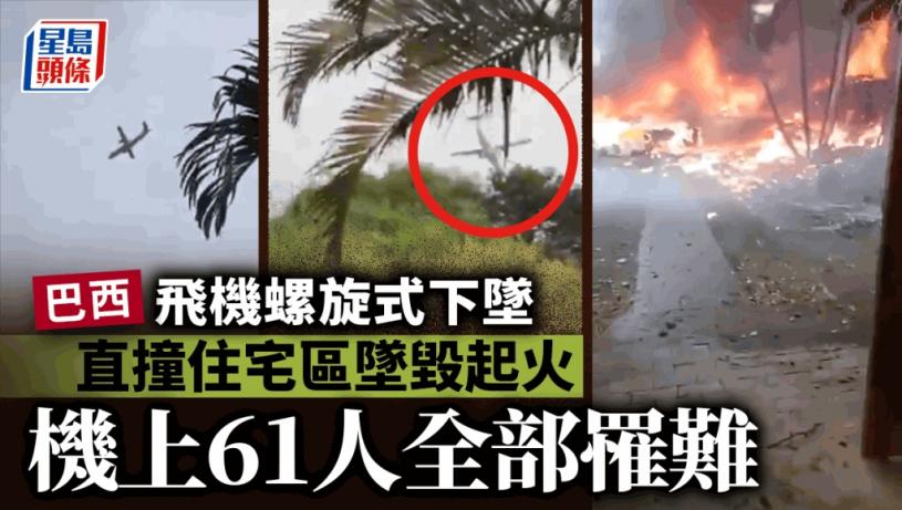 一架載有 62 人的飛機週五在巴西聖保羅州維涅多墜毀。從巴西電視台 GloboNews 播放的畫面顯示,在一個住宅區,一架明顯的飛機機身起火和冒煙。另外兩條片段分別顯示,一架飛機垂直向下墜,墜落時呈螺旋狀,以及飛機墮毀後燃起熊熊烈火。ATR-72飛機正從巴拉那州卡斯卡韋爾飛往聖保羅瓜魯柳斯。