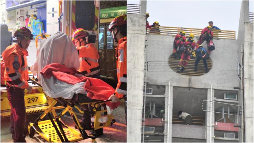 牛頭角彩霞邨彩月樓,今(9日)下午2時20分,保安報案指一名女子爬出欄杆危站,警方接報到場,出動談判專家游說,消防在地面開氣墊戒備,並出動飛將軍營救。