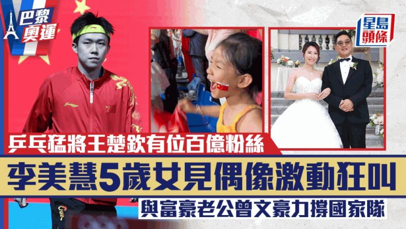 37歲、TVB「御用宮女」李美慧(ViVi)在2018年閃嫁年長25歲的百億富商曾文豪,同年10月誕下囡囡「小糖心」,去年6月再添細仔James,一家四口過着幸福生活,經常周遊列國。李美慧近日與老公及一對子女飛往巴黎觀賞多場奧運比賽,5歲餅印囡囡為中國乒乓球隊打氣,不單在臉上畫上中國國旗,她看到樊振東、馬龍及王楚欽出場時,更激動得狂叫!原來李美慧的百億囡囡是王楚欽粉絲。