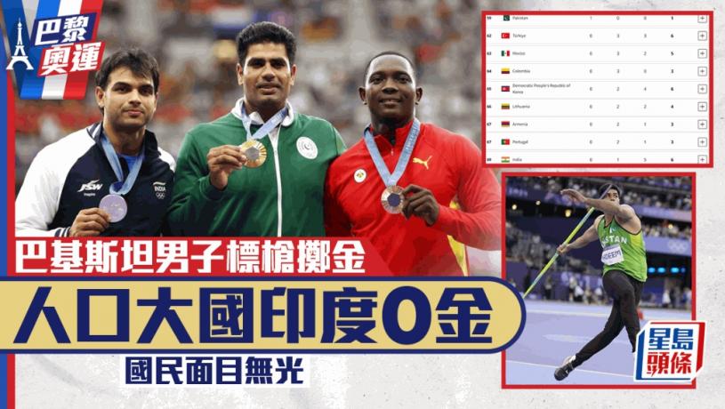 印度和巴基斯坦不合,兩國在奧運的成績也被拿來比較。當地時間8月8日,印巴在巴黎奧運田徑場上演了一場標槍大戰,印度選手丘帕拉(Neeraj Chopra)是上屆東京奧運標槍冠軍,成績是87.58米,當年拿到金牌也是印度隊唯一的金牌。他在巴黎賽場投出了超上屆成績的89.45米,沒料到來自巴基斯坦的納迪姆(Arshad Nadeem)投出了破奧運紀錄的92.97米,奪走金牌。納迪姆獲得的金牌是巴基斯坦在本屆奧運唯一金牌,但印度至今的金牌數是0。