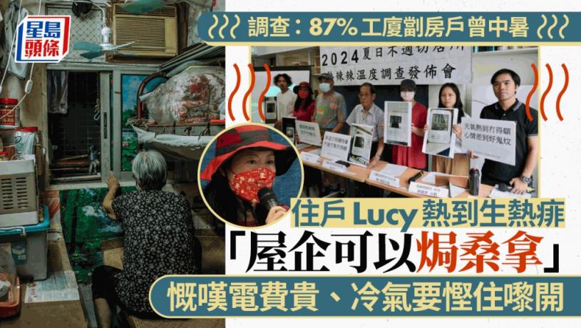 工廈住戶Lucy與孩子同住200呎劏房,她自嘲道「屋企可以焗桑拿」,即使是下午5時,室內溫度亦達30°C以上。她表示,現時每月電費數百元,價錢昂貴,開冷氣要「慳住嚟開」,更因此出現生熱痱的徵狀,唯有減少在家逗留,覺得「頂唔順」就去其他地方消暑。期望政府能夠讓她早日脫離劏房,或提供水電津貼緩燃眉之急。