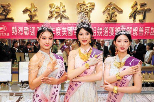 2024年美國華裔小姐競選獲獎佳麗6日拜會麗興恆生集團,其中冠軍何楚寧,亞軍潘家蕊及季軍張丁元分別展示該集團最新推出名貴足金套裝頸鏈,龍鳳鐲及18K白金高級紅寳套裝鑽飾。