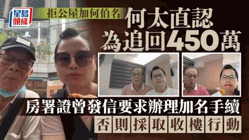 其後何太何伯在昨日(13日)再次進行直播,何太直認公屋不可加何伯名,否則等同不能追回450萬。「要打呢場仗一定唔可以加我老公嗰名,加我老公個名有人會捉住呢樣嘢,追唔番我老公筆錢」。如果他日在香港找不到住宿地方,就會返內地住,然後每日抽點時間落香港直播及在公屋打點一下事務。不過何太早前在直播中多次揚言,指「房屋署無證無據係無本事收我哋嘅屋」、「你有本事你嚟收」。
