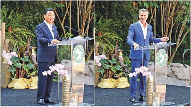 中國駐美大使謝鋒(左),加州州長紐森(右)出席聖地牙哥動物園大熊貓新館開幕儀式。中領館官網